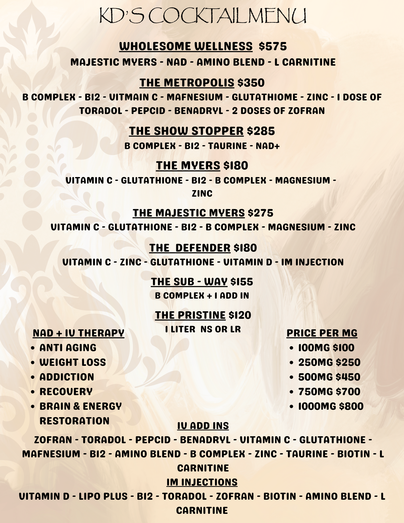 KD's Mobile IV offers a flexible pricing structure designed to cater to your specific health and wellness goals. We provide a variety of packages, individual infusions, and à la carte options, ensuring you can find the perfect fit for your needs and budget.